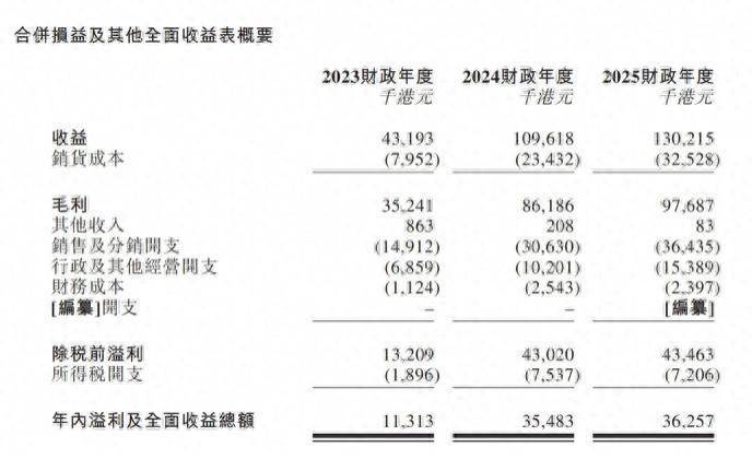 业绩表现来看,截至2025年3月31日止的3个财政年度(以下简称:报告期内,下同)公司实现收益分别约为0.43亿港元、1.10亿港元、1.3亿港元;同期,年内溢利及全面收益总额分别约为1131.3万港元、3548.3万港元、3625.7万港元。