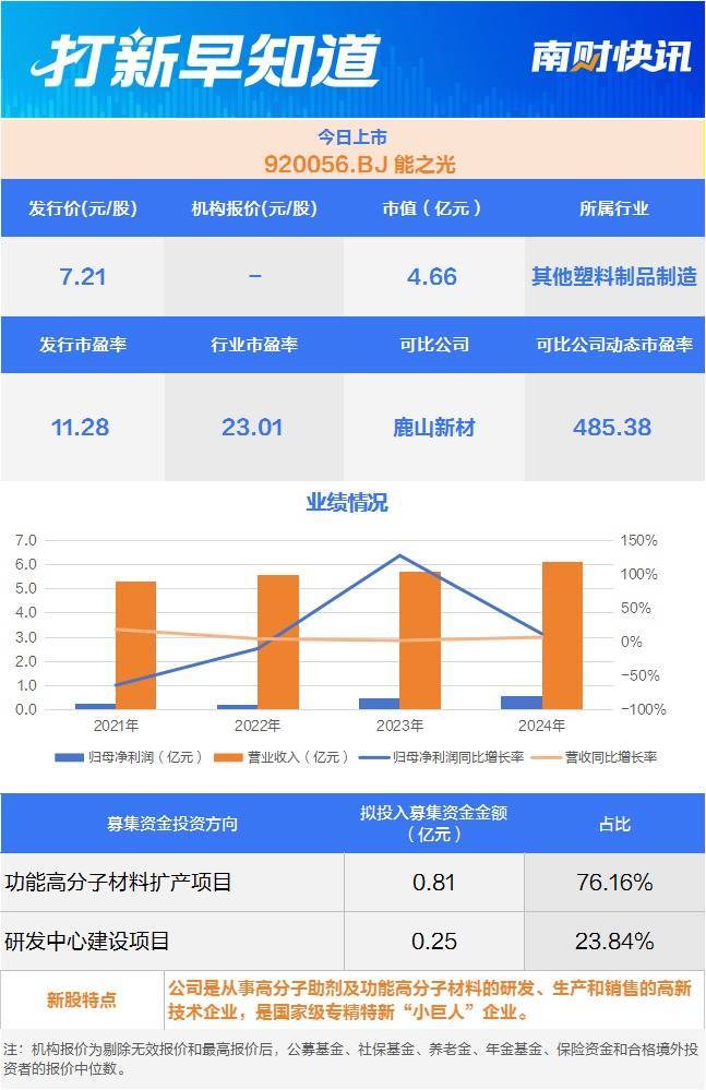 8月22日优配速至,北交所的新股能之光(920056.BJ)上市。该公司成立于2001年,注册地为宁波北仑,是一家从事高分子助剂及功能高分子材料的研发、生产和销售,为客户提供不同性质材料间相容或粘合所需的高分子材料及解决方案的高新技术企业,同时也是国家级专精特新“小巨人”企业。另据宁波晚报报道,该股为宁波今年“第一股”。