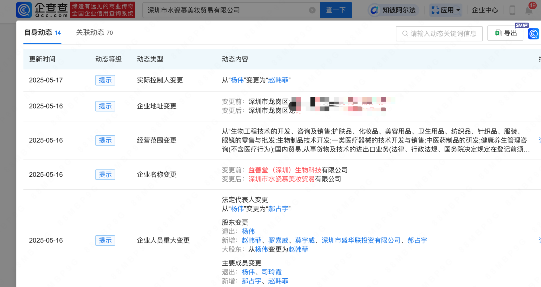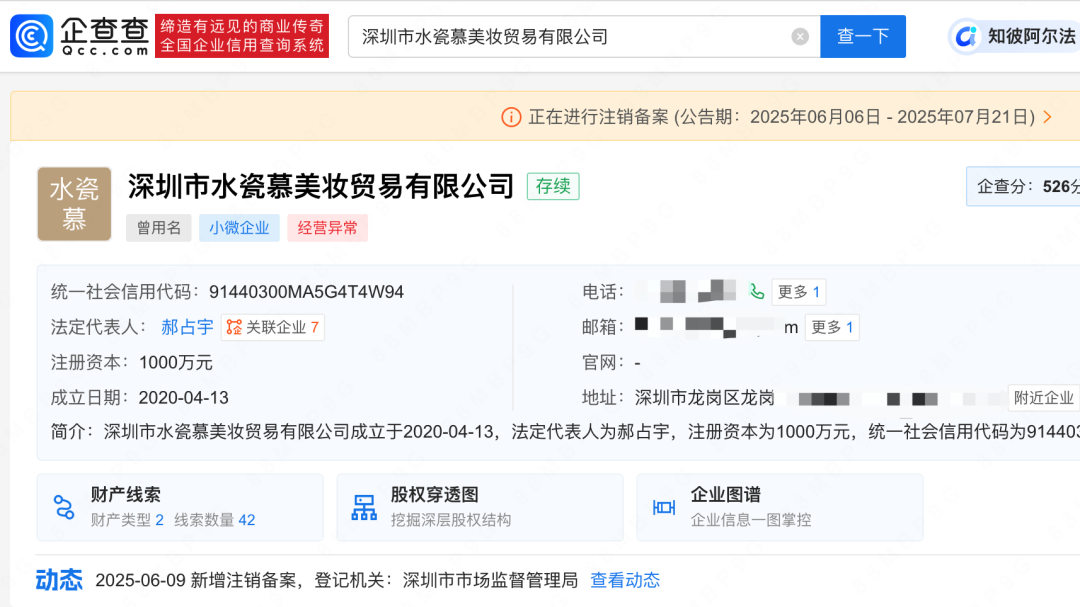 企查查APP显示,近日,深圳市水瓷慕美妆贸易有限公司新增注销备案公告,公告期自6月6日至7月21日,注销原因为决议解散。今年5月,黄杨钿甜父亲杨伟卸任该公司法定代表人并退出股东行列。6月,该公司因通过登记的住所或者经营场所无法联系,被列入经营异常名录。