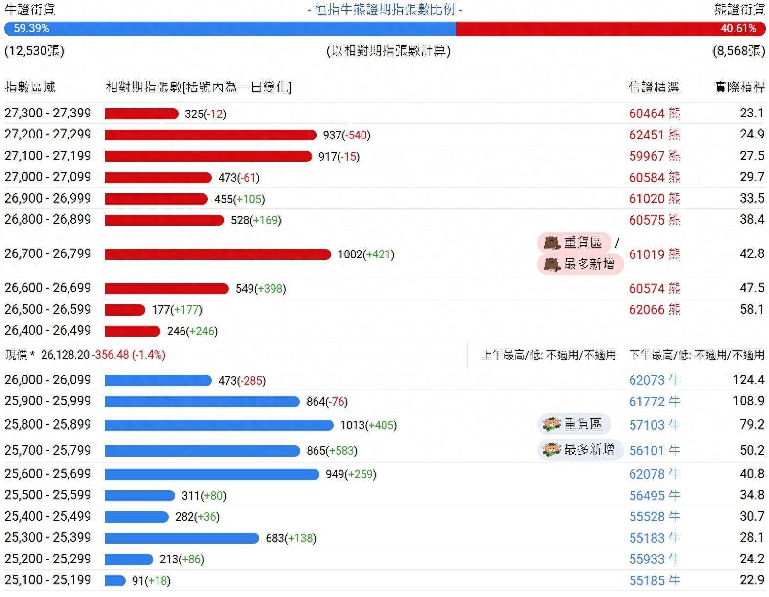 牛证街货重货区在25800-25899区间,该区间最新牛证数量为1013张,较上一交易日增加405张;牛证街货最多新增在25700-25799区间,该区间最新牛证数量为865张,较上一交易日增加583张。